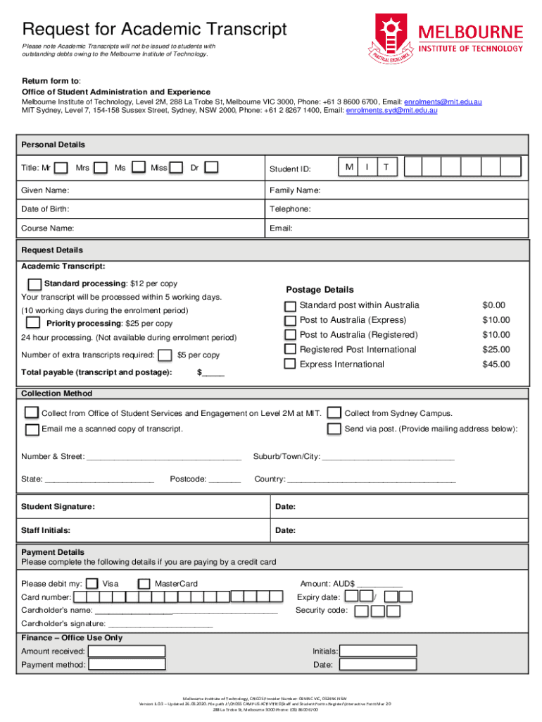Request for Academic Transcript Please note Academic Transcripts will not be issued to students with outstanding debts owing to the Melbourne Institute of Technology. Return form to: Office of Student