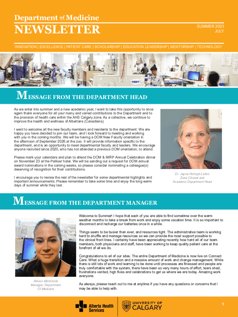 Department of MedicineNEWSLETTERSUMMER 2023 JULYINNOVATION | EXCELLENCE | PATIENT CARE | SCHOLARSHIP | EDUCATION LEADERSHIP | MENTORSHIP | TECHNOLOGYMESSAGE FROM THE DEPARTMENT HEAD As we enter into