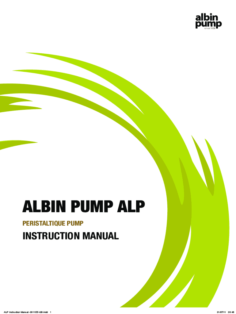 Since 1928ALBIN PUMP ALP PERISTALTIC PRE-INSTRUCTION MANUAL ALP Instruction Manual 2011EEGB. Indy 121/07/11 20:48since 1928ALP SAFETY AND CONTROL MEASURES TO RESPECT IMPERATIVELY 1 Mechanical risk