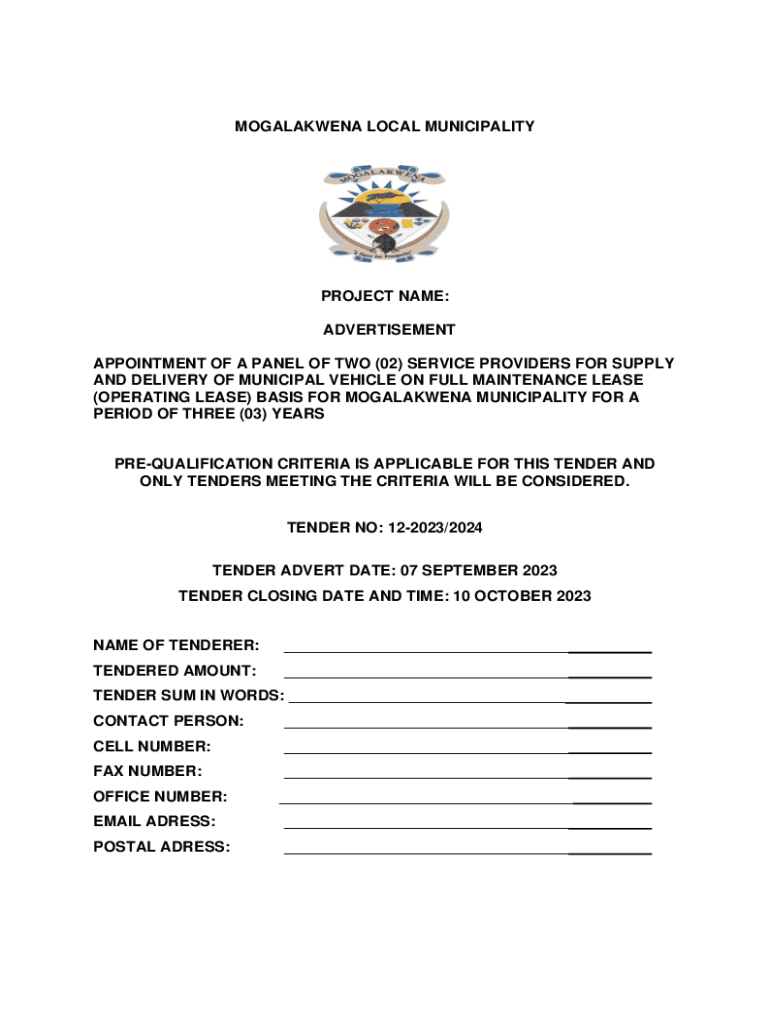 MOGALAKWENA LOCAL MUNICIPALITYPROJECT NAME: ADVERTISEMENT APPOINTMENT OF A PANEL OF TWO (02) SERVICE PROVIDERS FOR SUPPLY AND DELIVERY OF MUNICIPAL VEHICLE ON FULL MAINTENANCE LEASE (OPERATING LEASE)