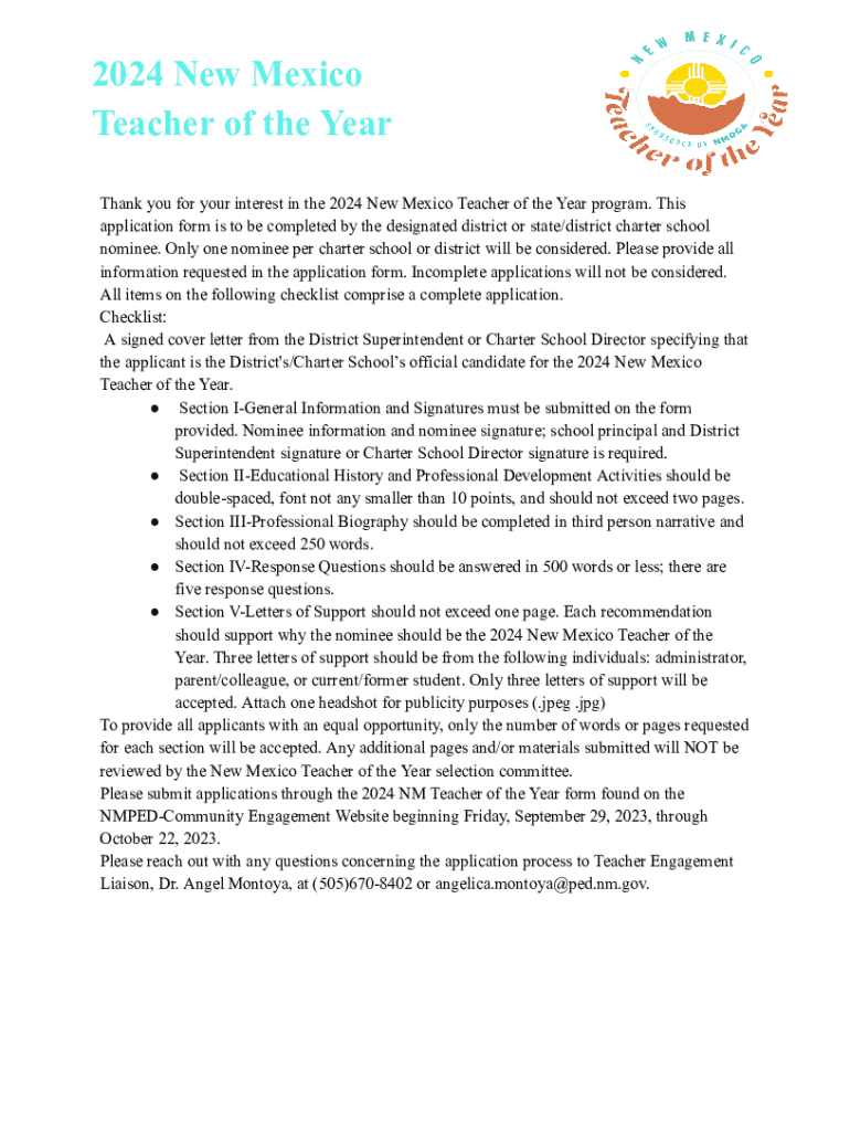 2024 New Mexico Teacher of the Year Thank you for your interest in the 2024 New Mexico Teacher of the Year program. This application form is to be completed by the designated district or state/district