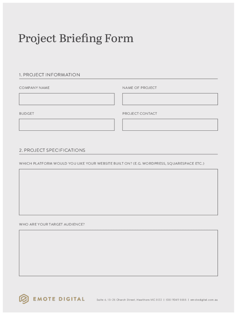 Project Briefing Form 1. PROJECT INFORMATION COMPANY NAMESAKE OF PROJECTBUDGETPROJECT CONTACT2. PROJECT SPECIFICATIONS WHICH PLATFORM WOULD YOU LIKE YOUR WEBSITE BUILT ON? (E.G. WordPress, SQUARESPACE