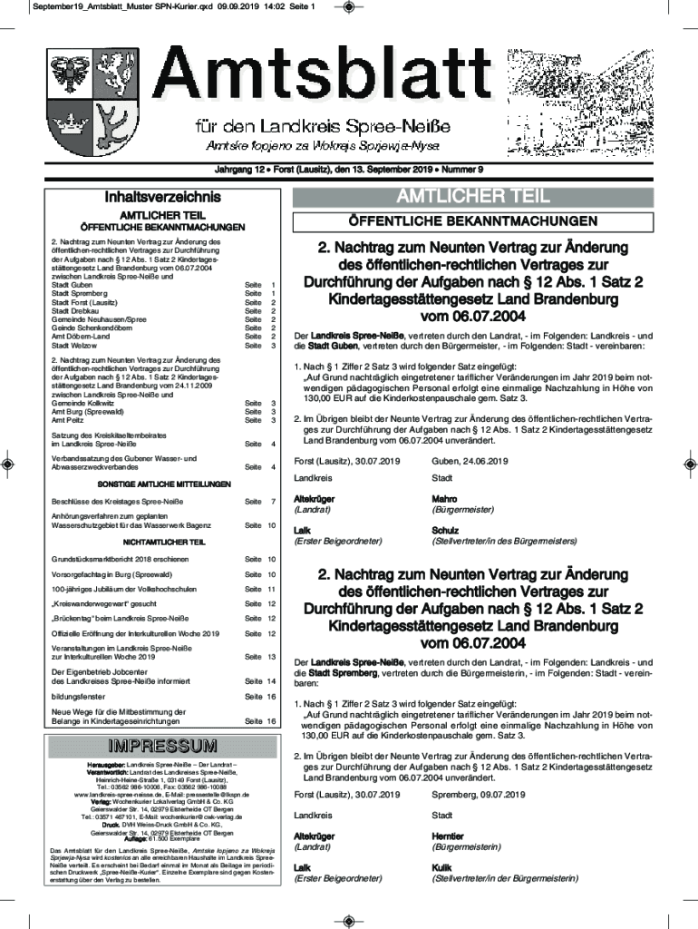 September19_Amtsblatt_Muster Spikier. QED 09.09.2019 14:02 Sate 1Jahrgang 12 First (Last), den 13. September 2019 Number 9InhaltsverzeichnisAMTLICHER TEILAMTLICHER TEILFFENTLICHE BEKANNTMACHUNGENFFENTLICHE