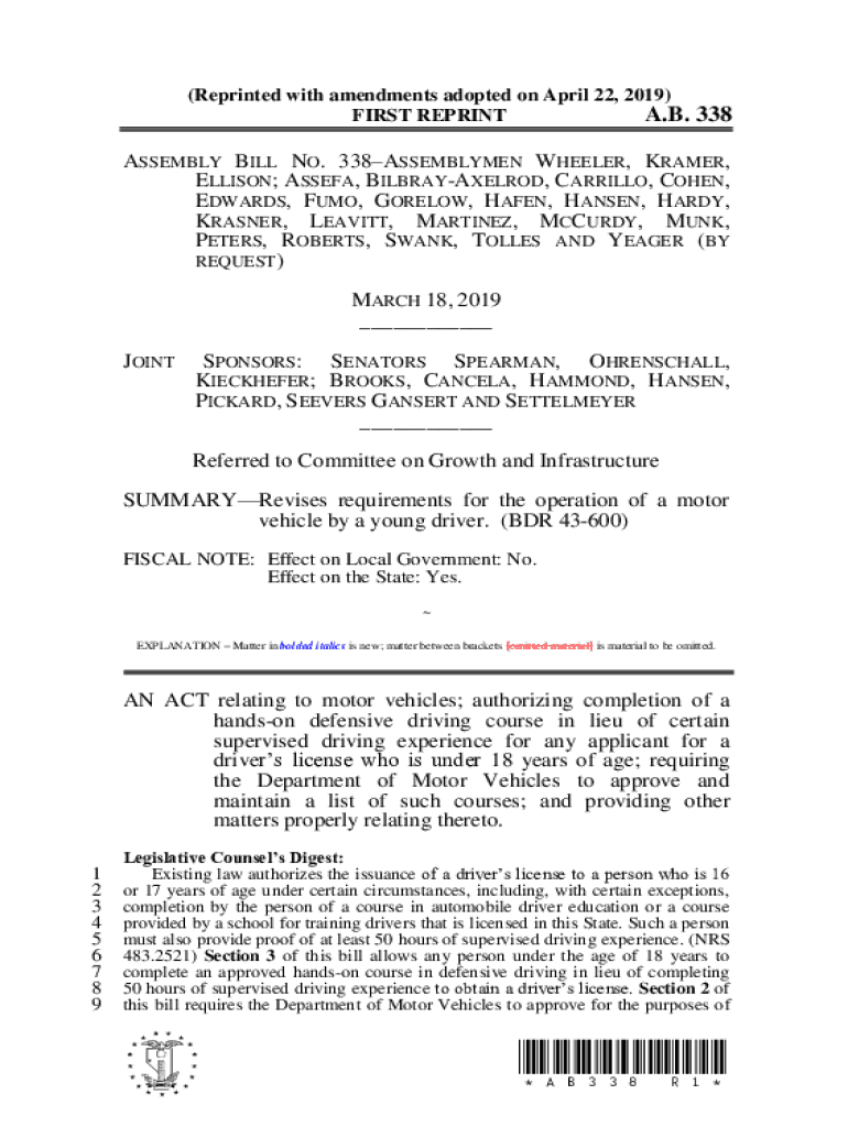 (Reprinted with amendments adopted on April 22, 2019) FIRST REPRINT A.B.338ASSEMBLY BILL NO. 338ASSEMBLYMEN WHEELER, KRAMER, ELLISON; ASS EFA, BILBRAYAXELROD, CARRILLO, COHEN, EDWARDS, SUMO, MORELOS,