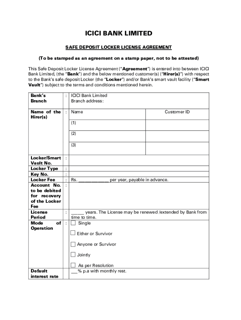 ICICI BANK LIMITED SAFE DEPOSIT LOCKER LICENSE AGREEMENT (To be stamped as an agreement on a stamp paper, not to be attested) This Safe Deposit Locker License Agreement (Agreement) is entered into