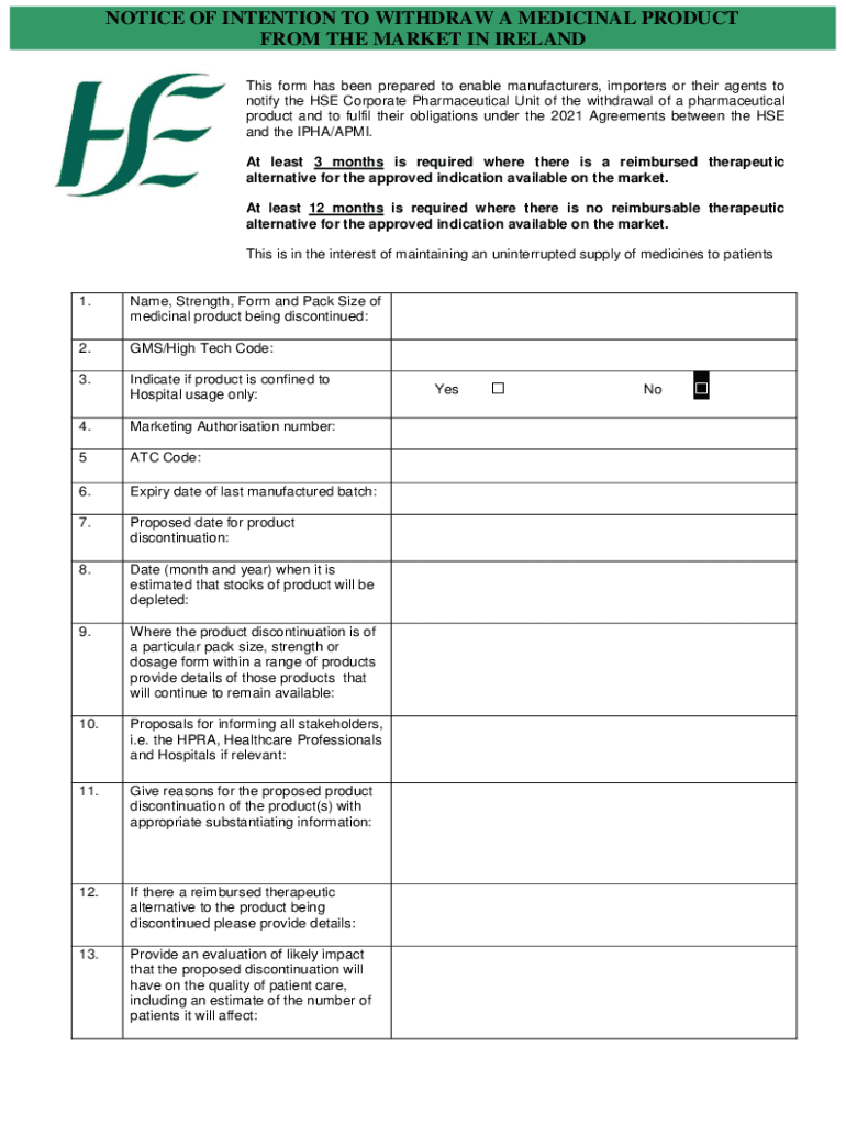 NOTICE OF INTENTION TO WITHDRAW A MEDICINAL PRODUCT FROM THE MARKET IN IRELAND This form has been prepared to enable manufacturers, importers or their agents to notify the HSE Corporate Pharmaceutical
