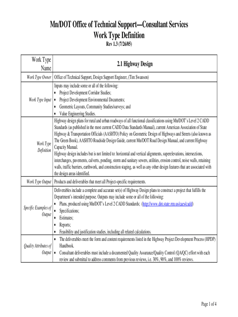 Mn/DOT Office of Technical SupportConsultant Services Work Type Definition Rev 1.3 (7/26/05)Work Type Name2.1 Highway Designer Type Owner Office of Technical Support, Design Support Engineer, (Tim