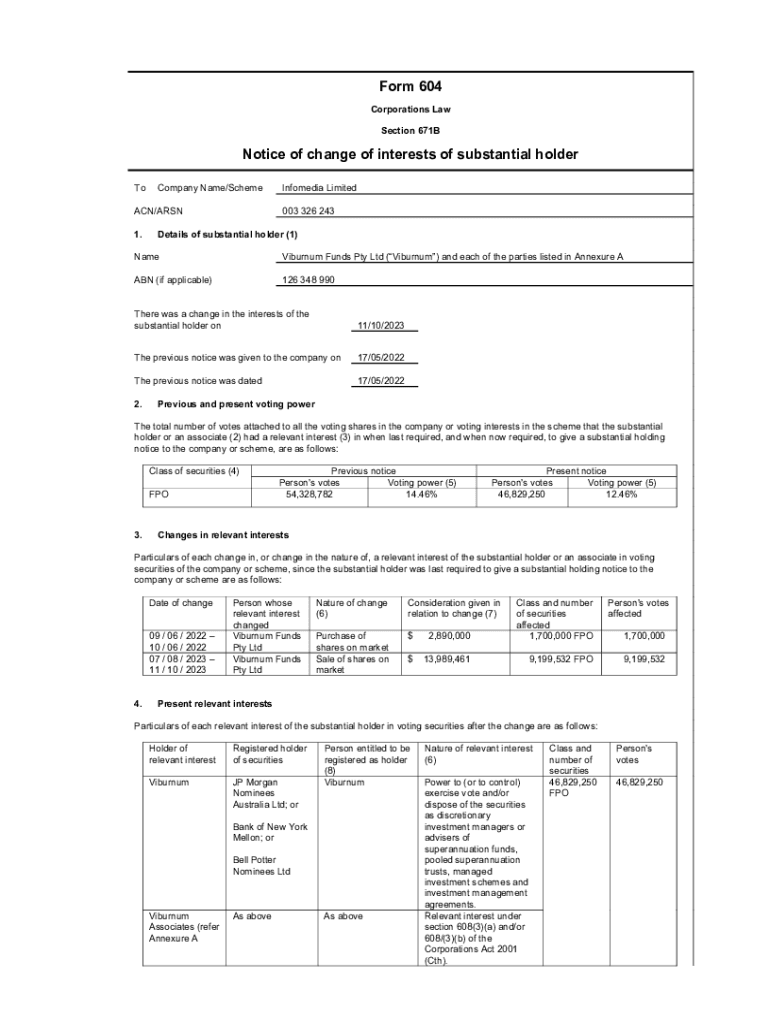 Form 604 Corporations Law Section 671BNotice of change of interests of substantial holder Company Name/Scheme ACN/ARSON 1. Info media Limited 003 326 243Details of substantial holder (1)NameViburnum