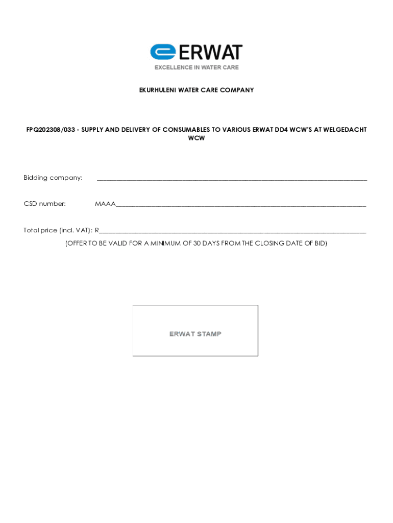 EKURHULENI WATER CARE COMPANYFPQ202308/033 SUPPLY AND DELIVERY OF CONSUMABLES TO VARIOUS GREAT DD4 WOWS AT WELGEDACHT Bidding company:___CSD number:MAAA___Total price (incl. VAT): R___ (OFFER TO BE