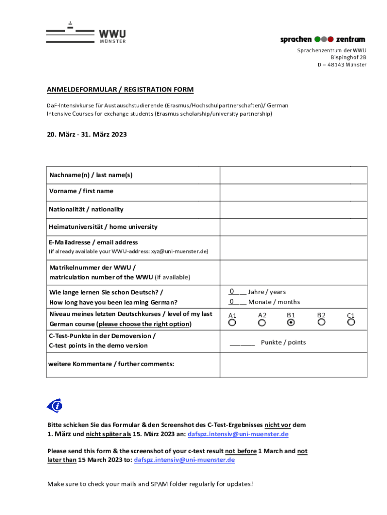 Sprachenzentrum her WWF Bispinghof 2B D 48143 MnsterANMELDEFORMULAR / REGISTRATION FORM DaFIntensivkurse for Austauschstudierende (Erasmus/Hochschulpartnerschaften)/ German Intensive Courses for exchange