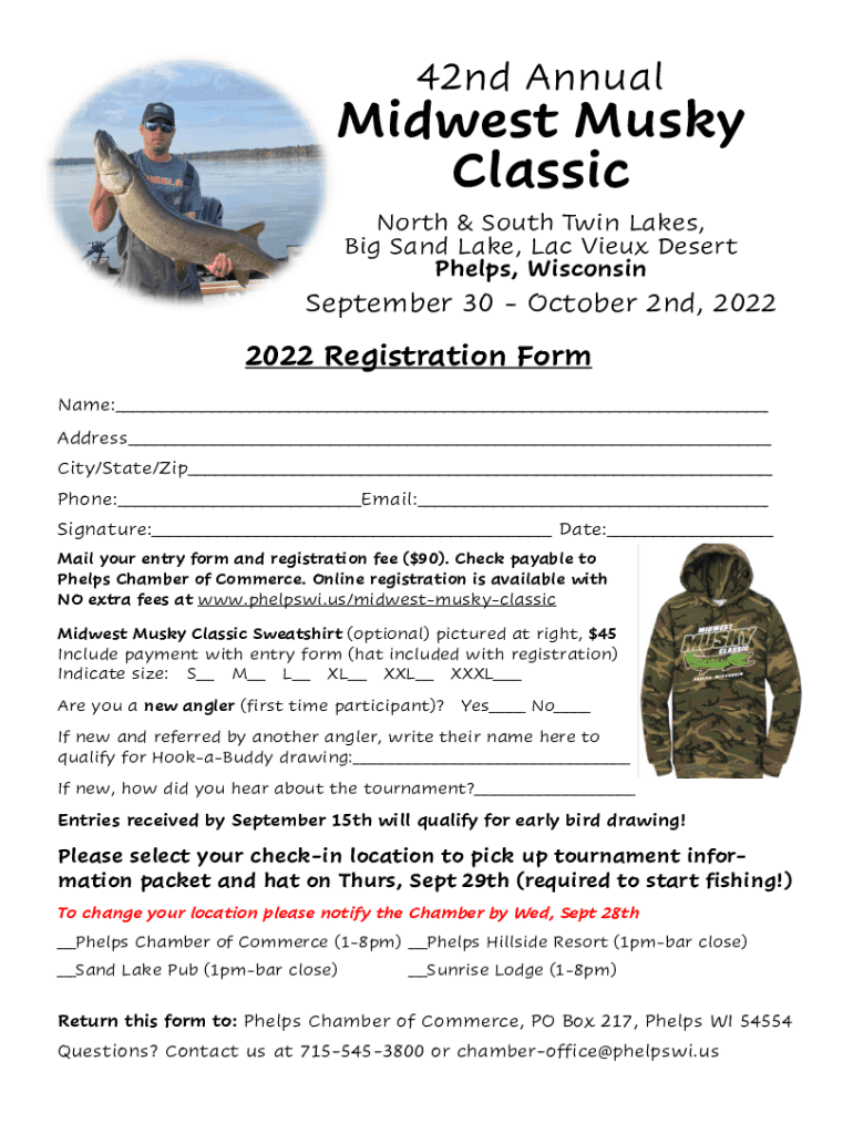 42nd Annual Midwest Musky Classic North & South Twin Lakes, Big Sand Lake, Lac Good Desert Phelps, Wisconsin September 30 October 2nd, 20222022 Registration Form Name:___ Address___ City/State/Zip___