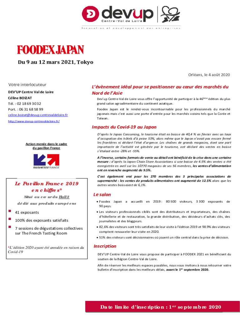 Du 9 au 12 Mars 2021, Tokyo Orleans, LE 4 AOT 2020Votre interlocutor DEBUT Center Val de Loire Cline BOAT Tl. 02 18 69 30 32 Port. 06 31 68 58 99 celine.boizat@devupcentrevaldeloire.fr http://www.devupcentrevaldeloire.fr/Lvnement