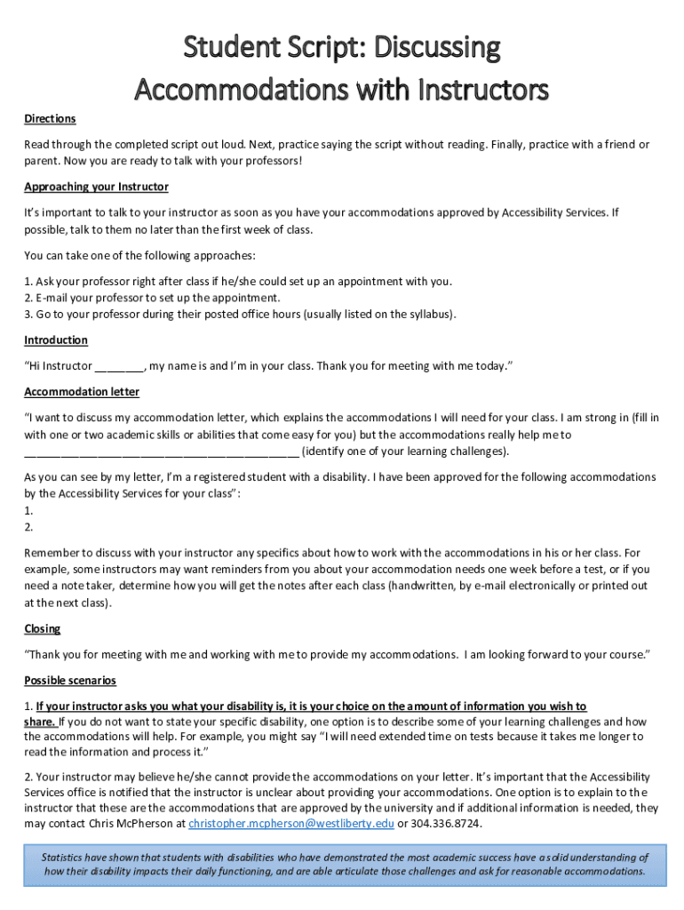 Student Script: Discussing Accommodations with Instructors Directions Read through the completed script out loud. Next, practice saying the script without reading. Finally, practice with a friend
