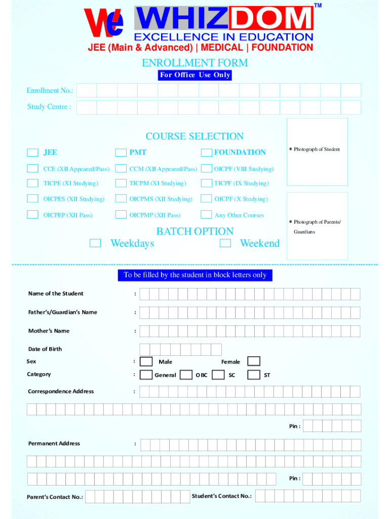 TMJ EE (Main & Advanced) | MEDICAL | FOUNDATIONENROLLMENT FORM For Office Use OnlyEnrollment No.: Study Center :COURSE SELECTIONCheck ListJEEPMTFOUNDATIONCCE (XII Appeared/Pass)CCM (XII Appeared/Pass)OI