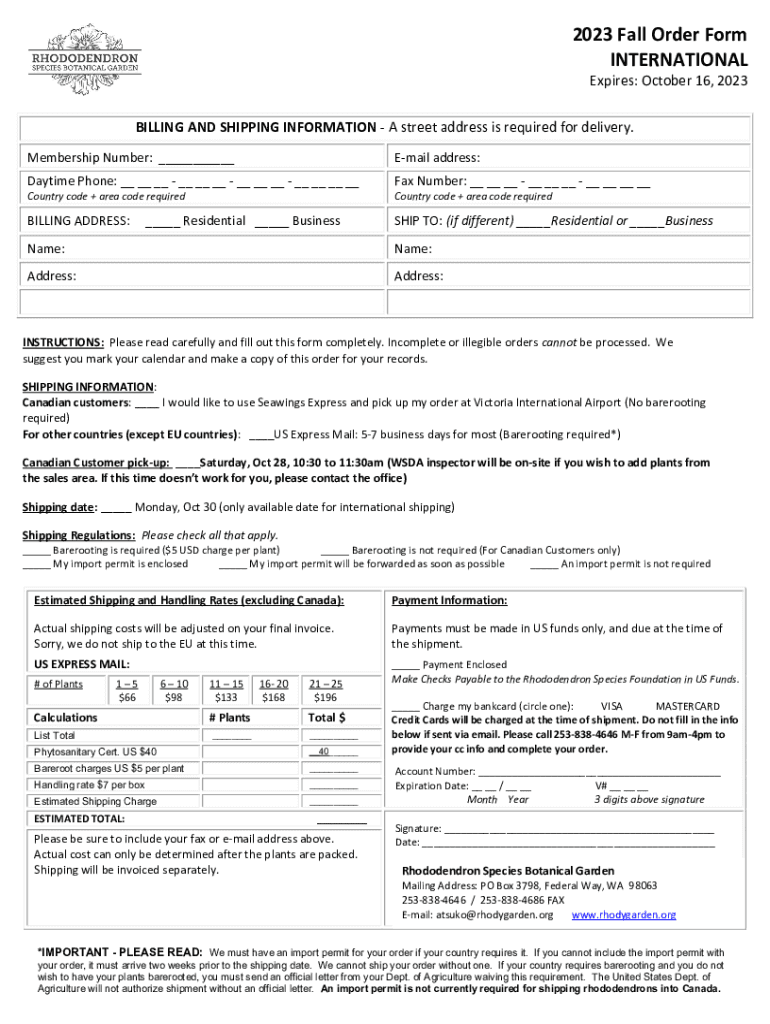 2023 Fall Order Form INTERNATIONAL Expires: October 16, 2023, BILLING AND SHIPPING INFORMATION A street address is required for delivery. Membership Number: ___Email address:Daytime Phone: __ __ __