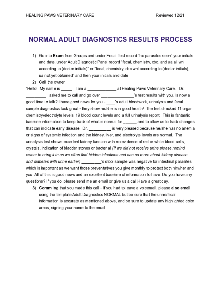 Get the free Normal Senior Diagnostic results process - Healing Paws Veterinary ...