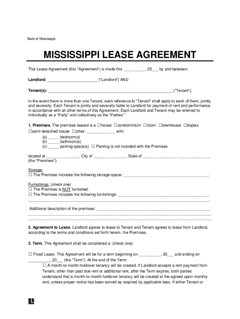 State of MississippiMISSISSIPPI LEASE AGREEMENT This Lease Agreement (this Agreement) is made this ___, 20___ by and between: Landlord: ___ (Landlord) AND Tenant(s): ___ (Tenant). In the event there