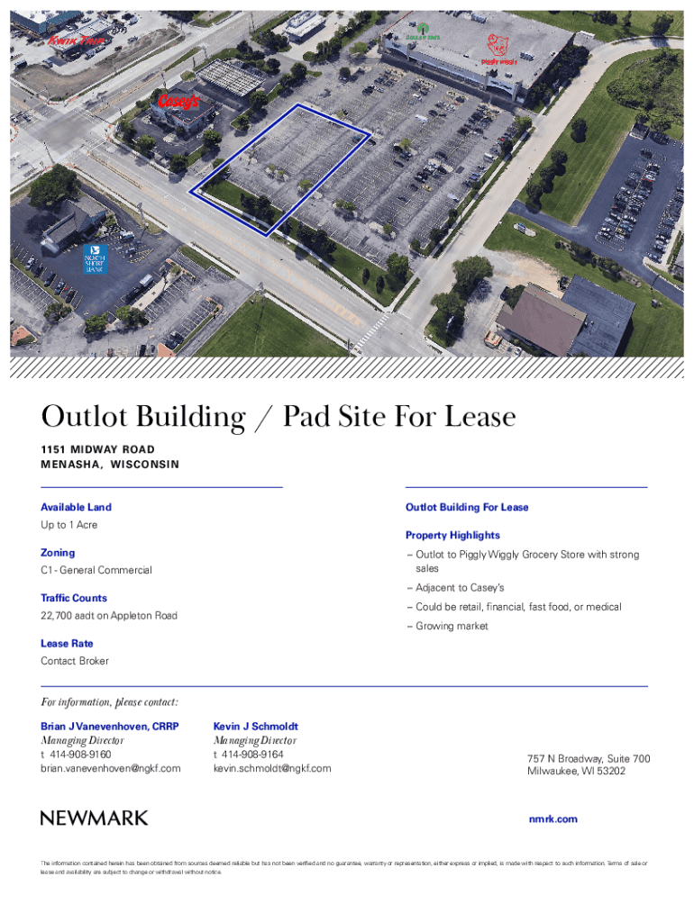 Outlet Building / Pad Site For Lease 11 51 M ID WAY ROA D MENUS HA, W I S C O NS Unavailable LandOutlot Building For Lease to 1 AcreProperty HighlightsZoning Outlet to Piggy Wiggly Grocery Store with