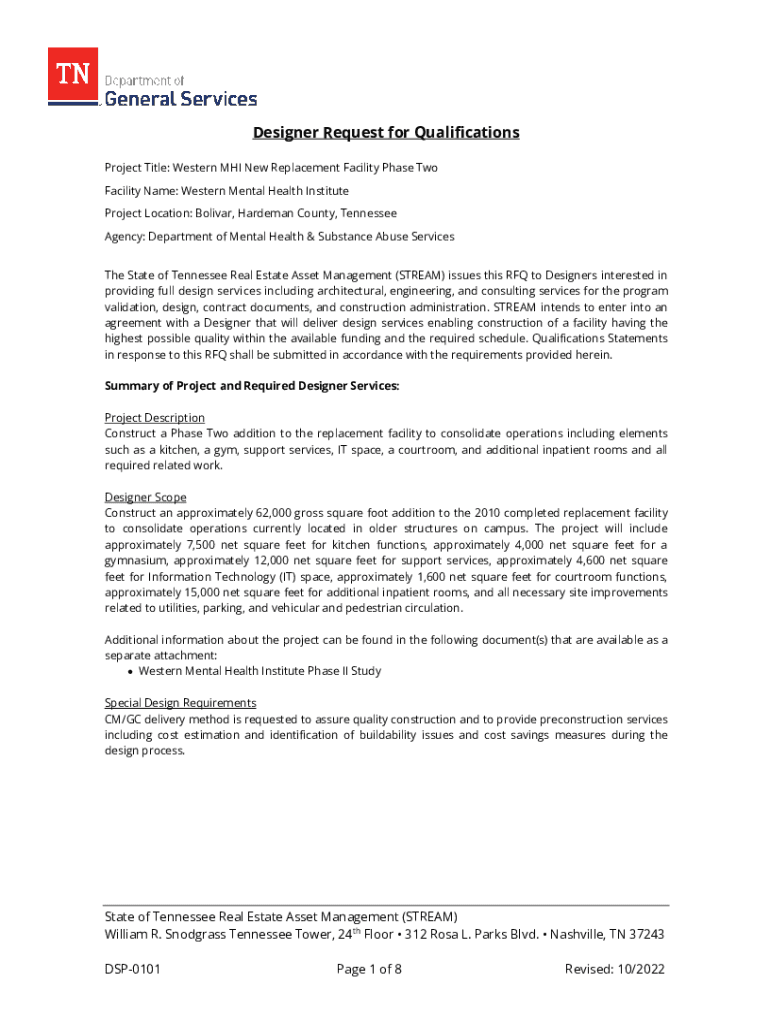 Designer Request for Qualifications Project Title: Western MRI New Replacement Facility Phase Two Facility Names: Western Mental Health Institute Project Location: Bolivar, Hartman County, Tennessee
