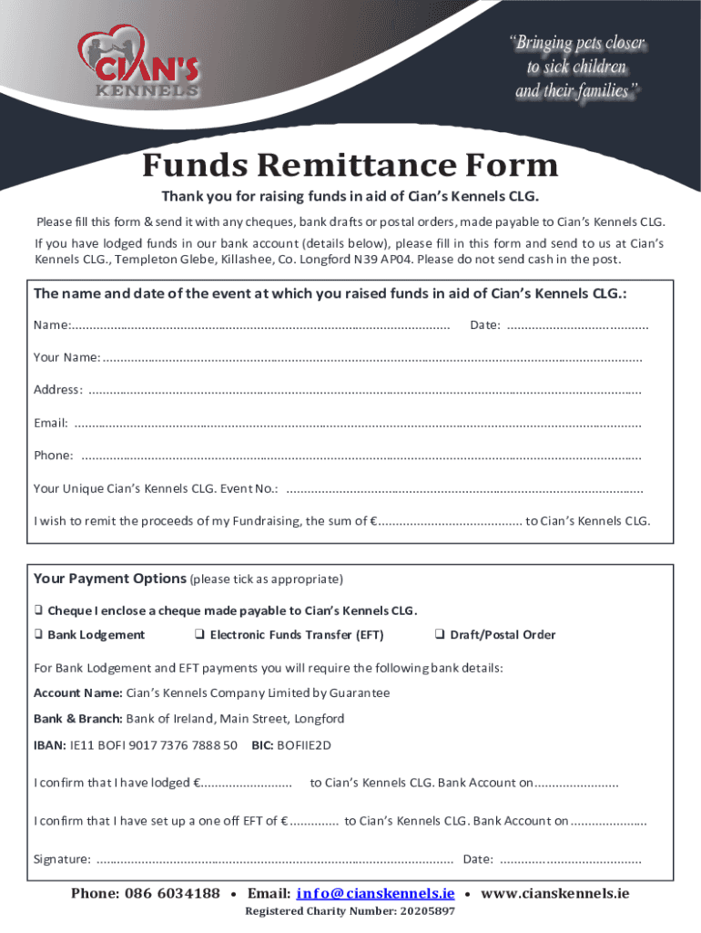Bringing pets closer to sick children and their familiesFunds Remittance Form Thank you for raising funds in aid of Clans Kennels CLG. Please fill this form & send it with any checks, bank drafts