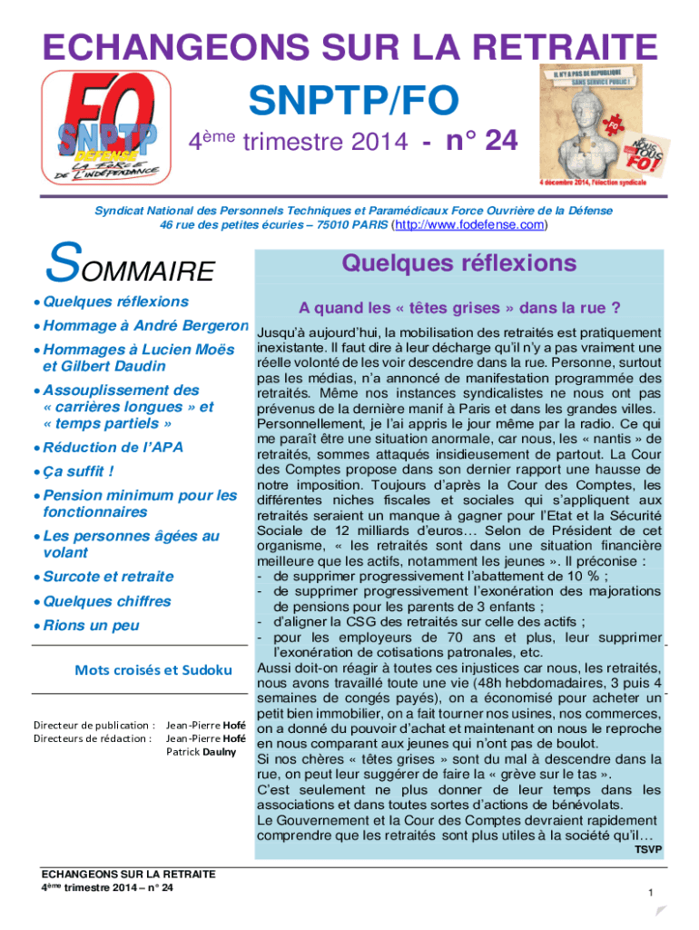 CHANGES SUR LA RETRAITESNPTP/FO 4me trimester 2014 n 24 Syndicate National DES Personnel Technique set Paramedical Force Outride DE la Defense 46 rue DES petites curies 75010 PARIS (http://www.fodefense.com)SUMMARY