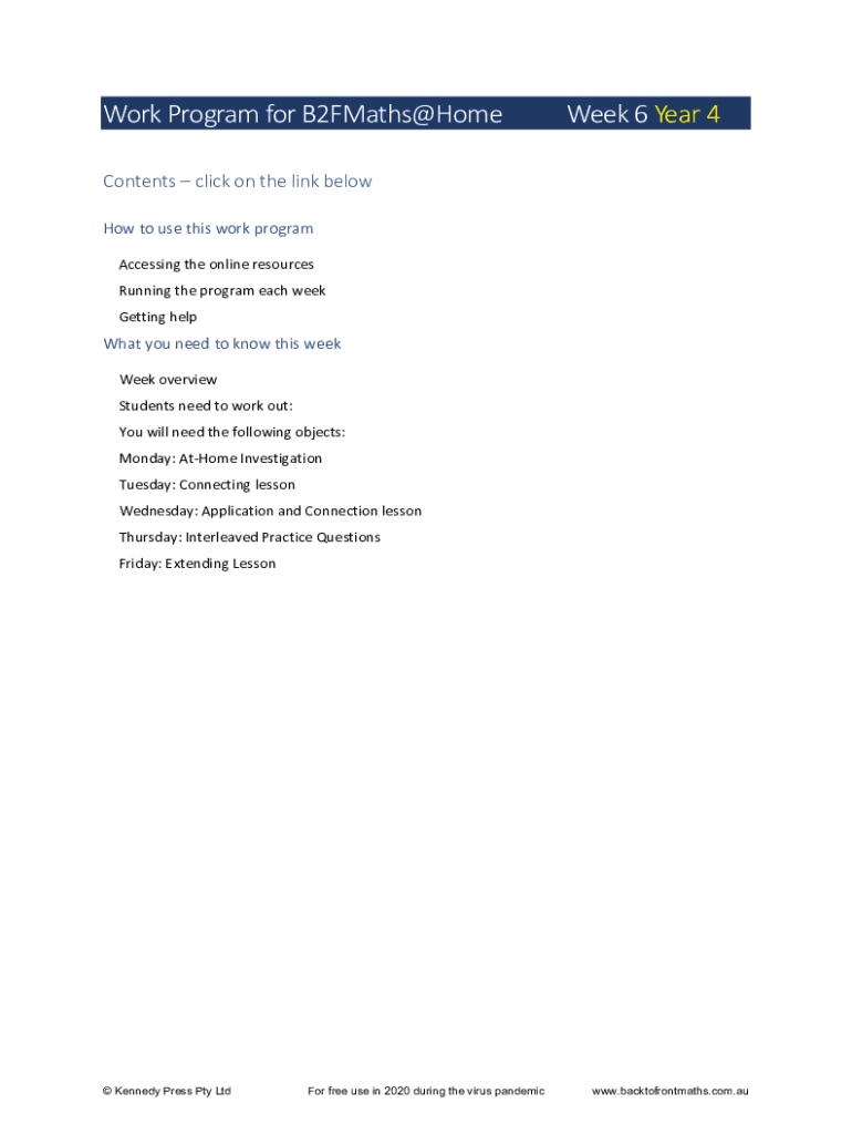 Work Program for B2FMaths@HomeWeek 6 Year 4Contents click on the link below How to use this work program Accessing the online resources Running the program each week Getting helpmate you need to know