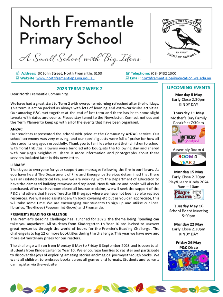 Address: 30 John Street, North Fremantle, 6159 Website: www.northfremantleps.wa.edu.au Telephone: (08) 9432 1300 Email: northfremantle.ps@education.wa.edu.au2023 TERM 2 WEEK 2UPCOMING Eventuate North
