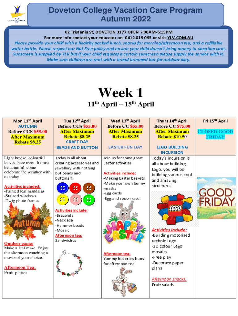 Dove ton College Vacation Care Program Autumn 2022 62 Tristan St, DOVECOT 3177 OPEN 7:00AM6:15PM For more info contact your educator on: 0412 019 095 or visit YLV.COM.AU Please provide your child