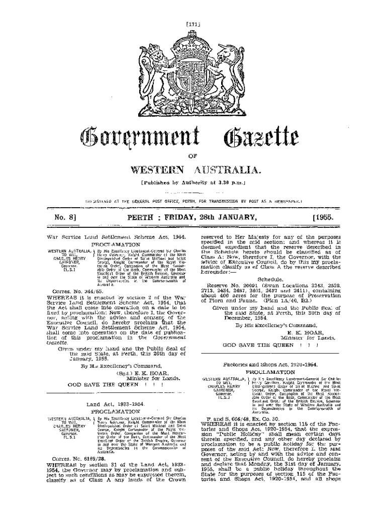 (171]government OWES\'I\'ERA [Published by Authority at 3.30 p.m.]l REGISTERED AT THE GENERAL POST OFFICE, PERTH, FOR TRANSMISSION BY POST AS A 1EWSPAPER. .In. 8]PERTH : FRIDAY, 28th JANUARY, War