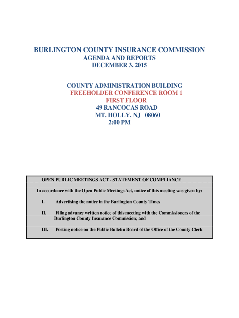 BURLINGTON COUNTY INSURANCE COMMISSION AGENDA AND REPORTS DECEMBER 3, 2015, COUNTY ADMINISTRATION BUILDING FREEHOLDER CONFERENCE ROOM 1 FIRST FLOOR 49 HANCOCK ROAD MT. HOLLY, NJ 08060 2:00 PMO PEN
