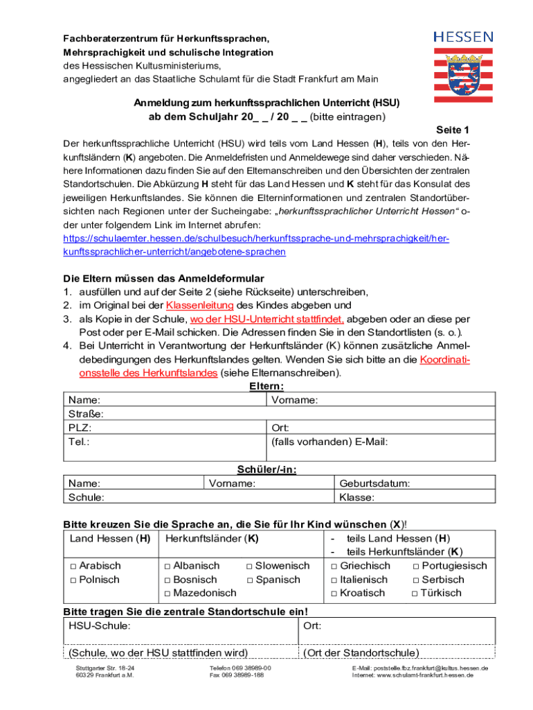 Zuerst müssen Sie das Formular für die Herkunftssprachenschulmter Hessen herunterladen.