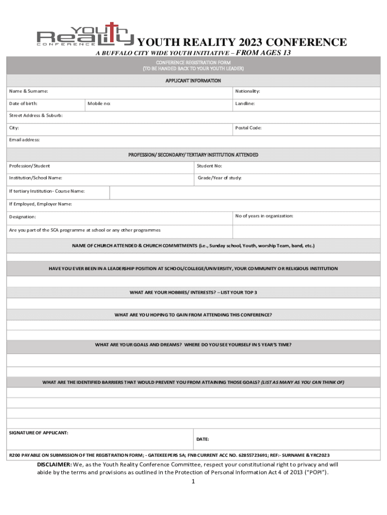 YOUTH REALITY 2023 CONFERENCE A BUFFALO CITY WIDE YOUTH INITIATIVE FORAGES 13CONFERENCE REGISTRATION FORM (TO BE HANDED BACK TO YOUR YOUTH LEADER) APPLICANT INFORMATION Name & Surname:Nationality:Date