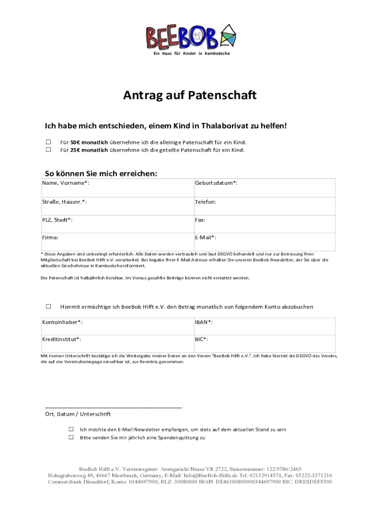 Auf dem Formular müssen persönliche Informationen des Paten und gegebenenfalls Details zum Patenkind oder Projekt angegeben werden, wie Name, Geburtsdatum und Kontaktdaten.