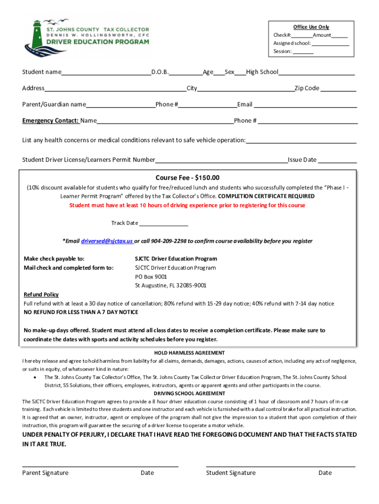 Session:Student named. O.B. AddressAgeSexHigh SchoolCityParent/Guardian name Telephone #EmailEmergency Contact: Telephone #List any health concerns