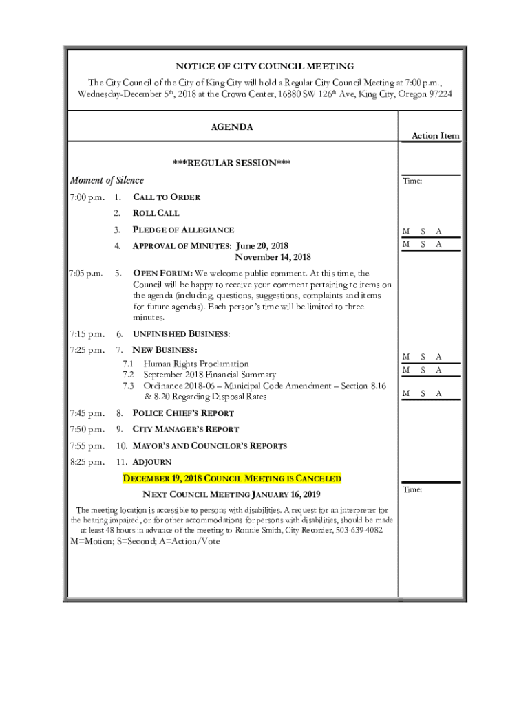 NOTICE OF CITY COUNCIL MEETING The City Council of the City of King City will hold a Regular City Council Meeting at 7:00 p.m., Wednesday, December 5th, 2018 at the Crown Center, 16880 SW 126th Ave,