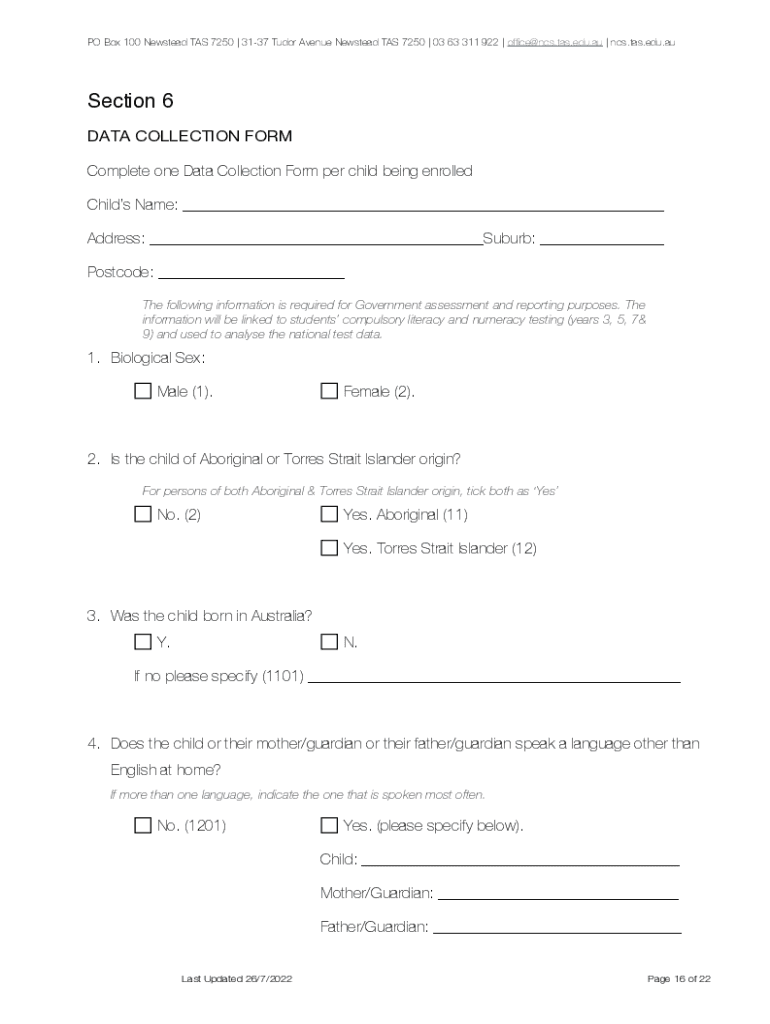 PO Box 100 New stead TAS 7250 | 3137 Tudor Avenue New stead TAS 7250 | 03 63 311 922 | office@ncs.tas.edu.au | NCS.TAS.edu.section 6 DATA COLLECTION FORM Complete one Data Collection Form per child
