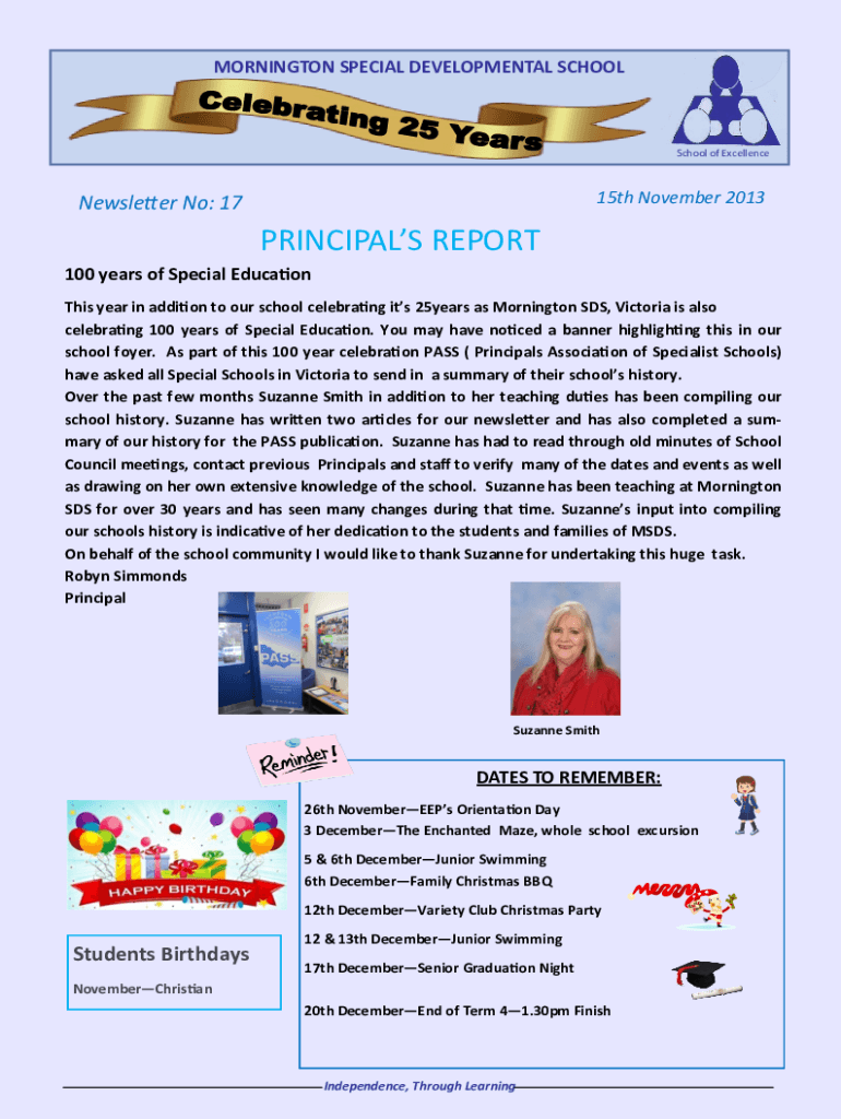 TORRINGTON SPECIAL DEVELOPMENTAL SCHOOLSchool of Excellence15th November 2013Newsletter No: 17PRINCIPALS REPORT 100 years of Special Education This year in addition to our school celebrating its 25years