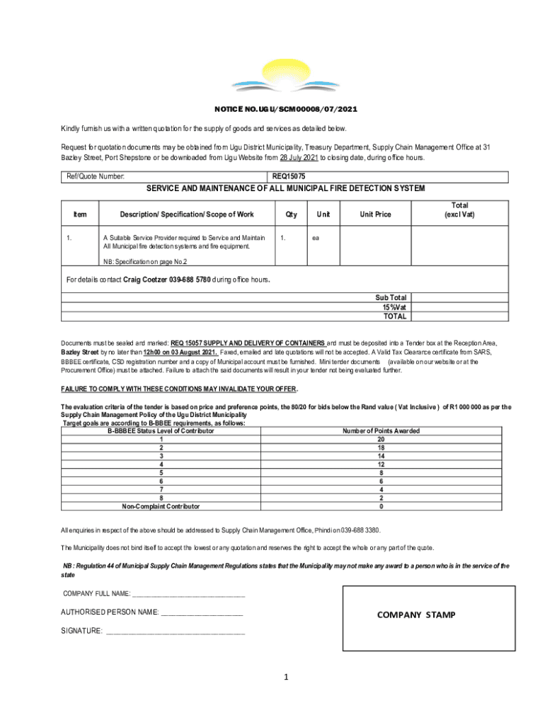 NOTICE NO.UGU/SCM00008/07/2021 Kindly furnish us with a written quotation for the supply of goods and services as detailed below. Request for quotation documents may be obtained from UGU District