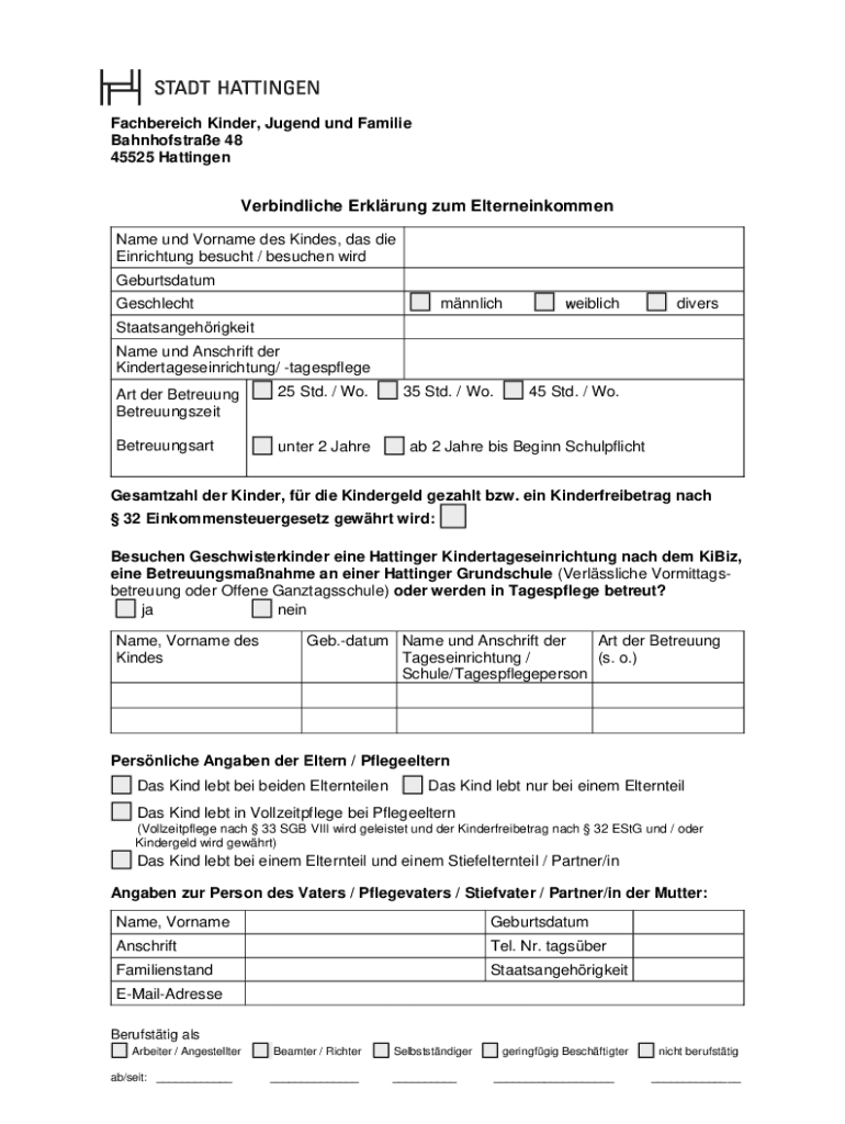 Fachbereich Kinder, Jug end UND Families Bahnhofstrae 48 45525 HattingenVerbindliche Erlang sum Elterneinkommen Name UND Surname DES Kinds, was die Enriching besought / beaches word Geburtsdatum mnnlichGeschlechtweiblichdiversStaatsangehrigkeit