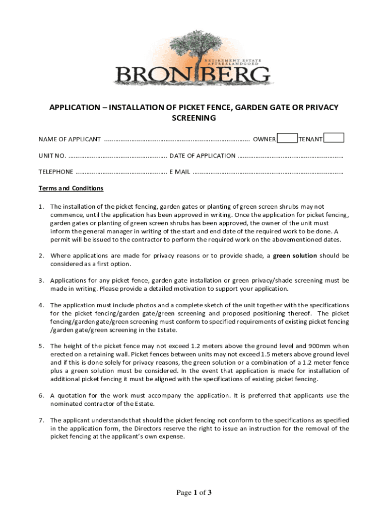 APPLICATION INSTALLATION OF PICKET FENCE, GARDEN GATE OR PRIVACY SCREENING NAME OF APPLICANT ................................................................................. OWNERTENANTUNIT NO. .......................................................