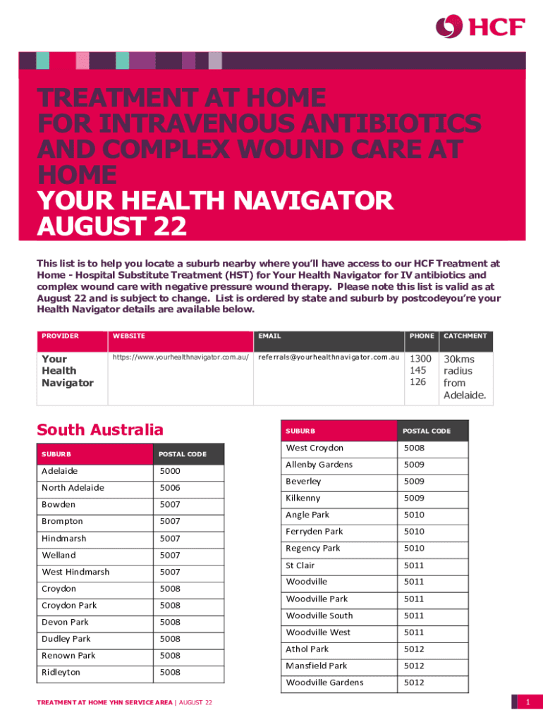 TREATMENT AT HOME FOR INTRAVENOUS ANTIBIOTICS AND COMPLEX WOUND CARE AT HOME YOUR HEALTH NAVIGATOR AUGUST 22 This list is to help you locate a suburb nearby where you'll have access to our CF Treatment