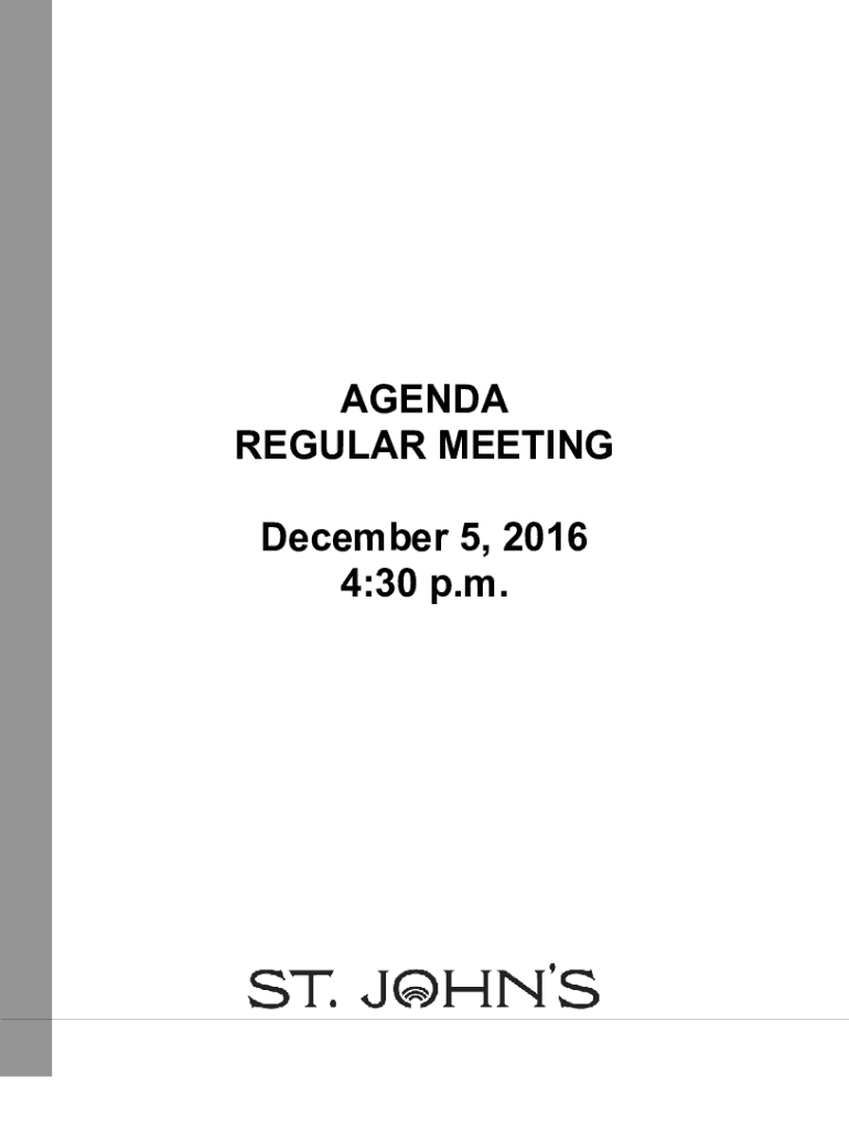 AGENDA REGULAR MEETING December 5, 2016 4:30 p.m.MEMORANDUM December 3, 2016In accordance with Section 42 of the City of St. Johns Act, the Regular Meeting of the St. Johns Municipal Council will