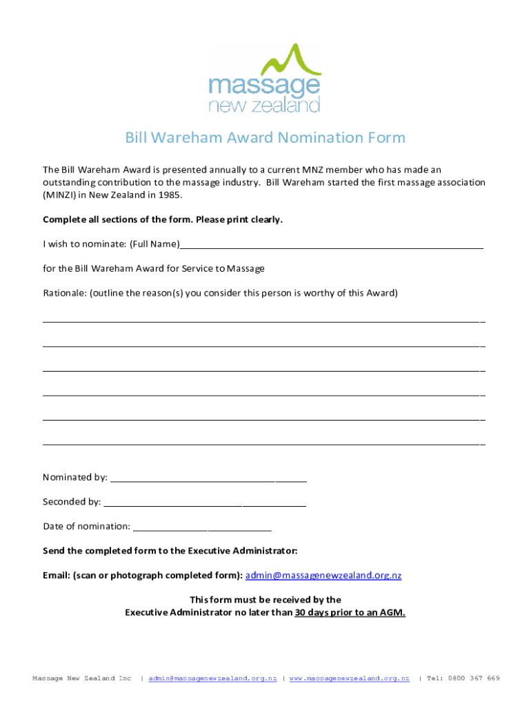 Bill Ware ham Award Nomination Form The Bill Ware ham Award is presented annually to a current MNA member who has made an outstanding contribution to the massage industry. Bill Ware ham started the