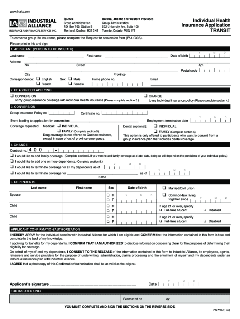 Get the free 4 0 0 Individual Health Insurance Application TRANSIT