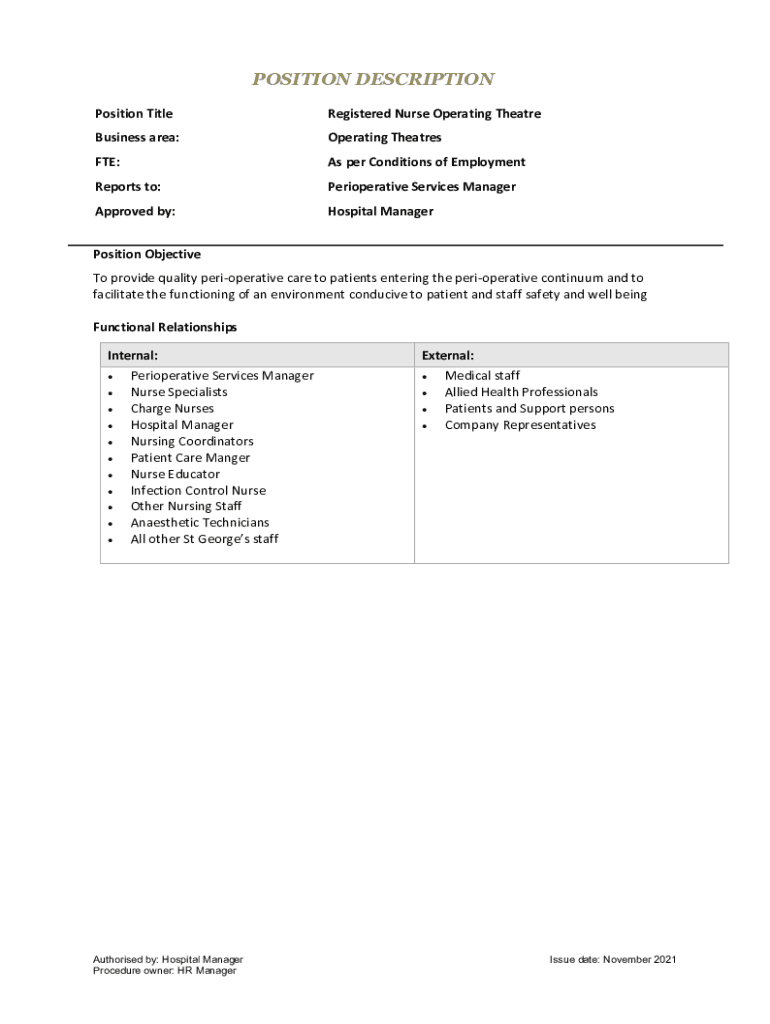 Position TitleRegistered Nurse Operating TheatreBusiness area:Operating TheatresFTE:As per Conditions of EmploymentReports to:Perioperative Services ManagerApproved by:Hospital