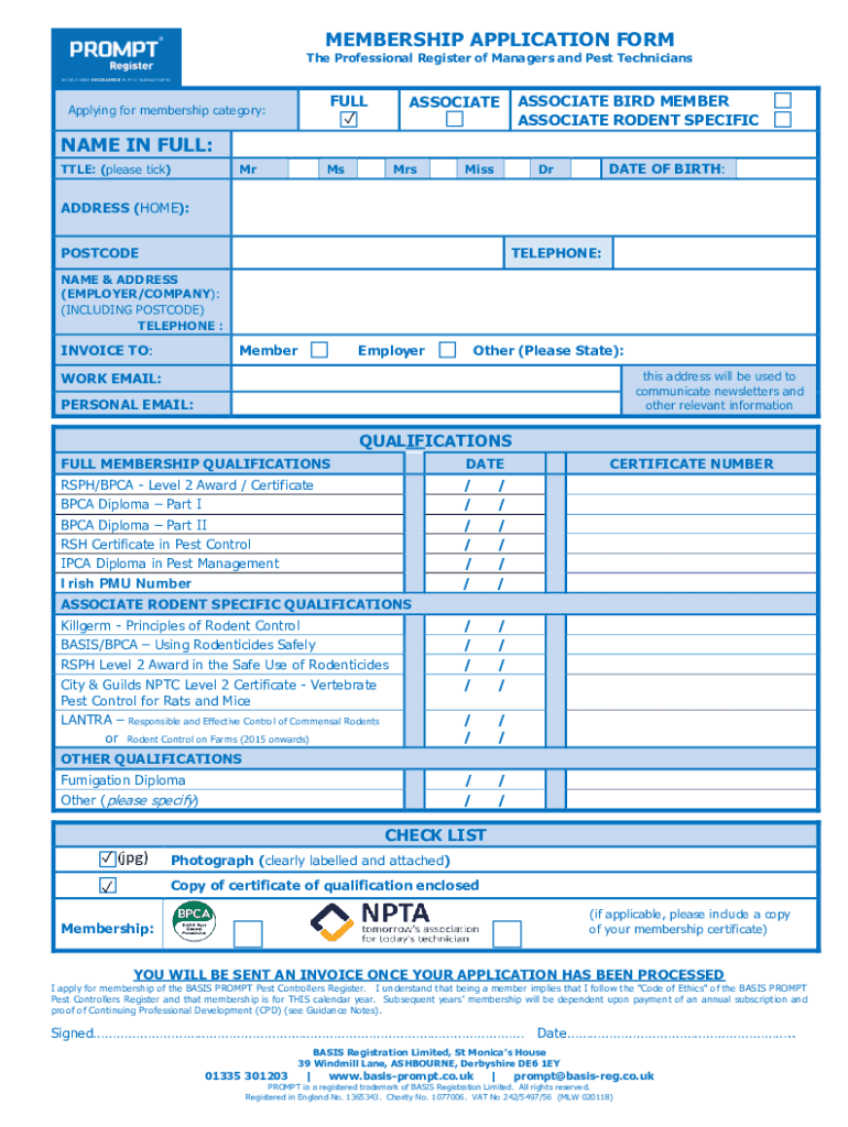 MEMBERSHIP APPLICATION From The Professional Register of Managers and Pest TechniciansFULL Applying for membership category:ASSOCIATE BIRD MEMBER ASSOCIATE RODENT SPECIFICASSOCIATENAME IN FULL: TITLE: