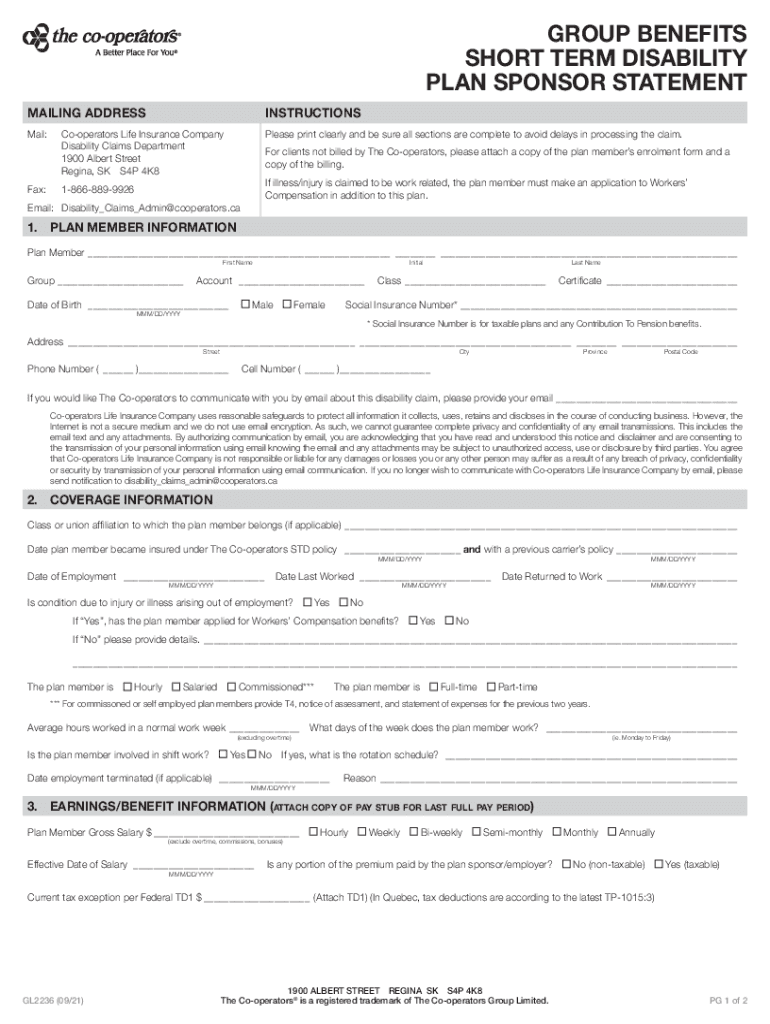 GROUP BENEFITS SHORT TERM DISABILITY PLAN SPONSOR STATEMENT MAILING ADDRESSINSTRUCTIONSMail:Cooperators Life Insurance Company Disability Claims Department 1900 Albert Street Regina, SK S4P 4K8Please