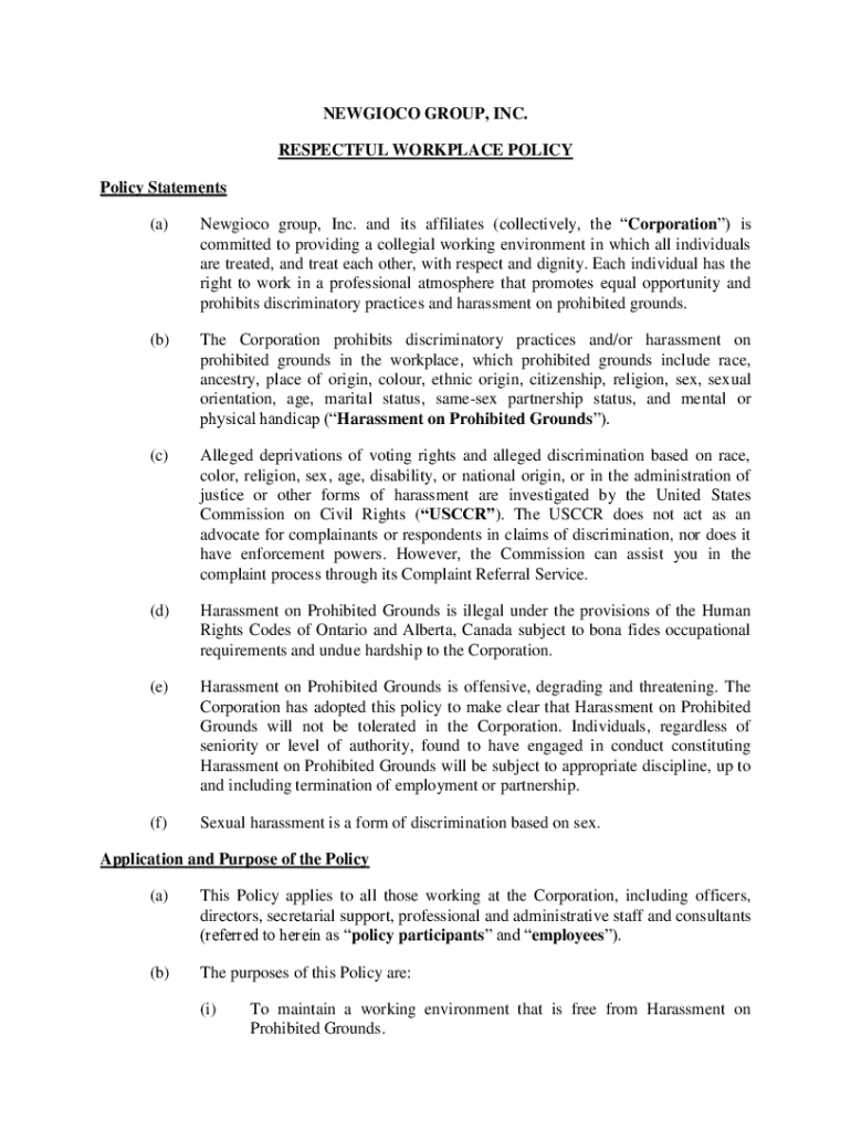 NEWGIOCO GROUP, INC. RESPECTFUL WORKPLACE POLICY Statements (a)Newgioco group, Inc. and its affiliates (collectively, the Corporation) is committed to providing a collegial working environment in