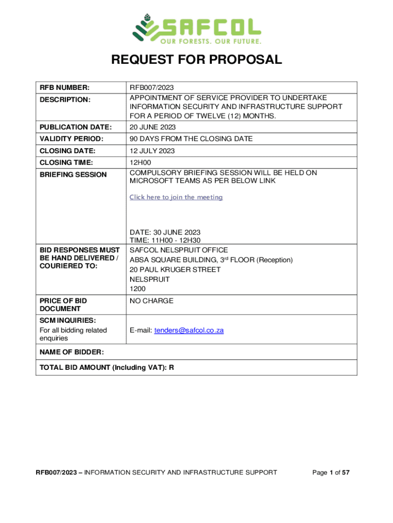 REQUEST FOR PROPOSAL ROB NUMBER: DESCRIPTION:RFB007/2023 APPOINTMENT OF SERVICE PROVIDER TO UNDERTAKE INFORMATION SECURITY AND INFRASTRUCTURE SUPPORT FOR A PERIOD OF TWELVE (12) MONTHS.PUBLICATION