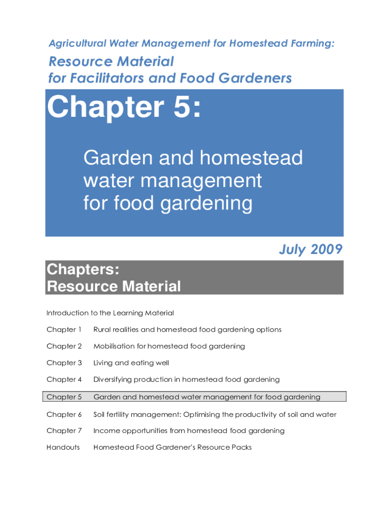 Agricultural Water Management for Homestead Farming:Resource Material for Facilitators and Food GardenersChapter 5: Garden and homestead water management for food gardening July 2009Chapters: Resource